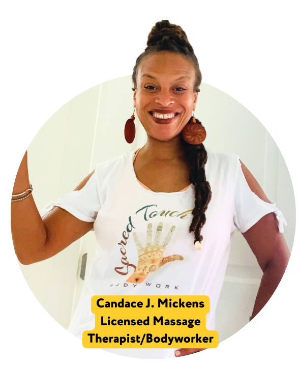 Candace Mickens (she/her) is a bodyworker and a certified provider of Sacred Touch, Breath and Movement. She is a Yoga Teacher, Licensed Massage Therapist, Energy Worker and Non-Profit Management Consultant. Sacred Touch Bodywork is the vehicle through which Candace offers her services and African Dance, Tai Chi, Yoga is her personal fuel.